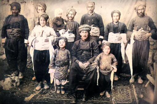 An example of a historical picture of the Mukeriyan region with Kurdish traditional clothes from one hundred years ago of the Fayzollabaigis clan. The seated ones are: Haji Shahab (Faraydoun Bag Tirkasha) Amiri son of Mirbag son of Haji Mohammad Hassan Bag son of Agha Fayzollabag Mukri with his sons and his men.