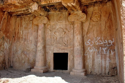 لەسەر دەرگای چوونە ژوورەوە، نەخشی دوو پاشا هەڵکۆڵراوە کە بەرانبەر بە یەکتر ڕاوەستاون و بە دەستی چەپ کەوانەکەیان لەسەر زەوی ڕاگرتووە و بە دەستی راست بە نیشانەی ئاشتی سڵاو لە یەکتر دەکەن. لە نێوانیاندا نەخشی سەکۆیەک هەڵکۆڵراوە کە لەسەر سەکۆکەش نیوەگۆیەک دەبینرێ.