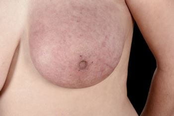 - Changes in breast shape, such as sagging, hardening, or the appearance of colored spots around the areola or on the skin of the breast.